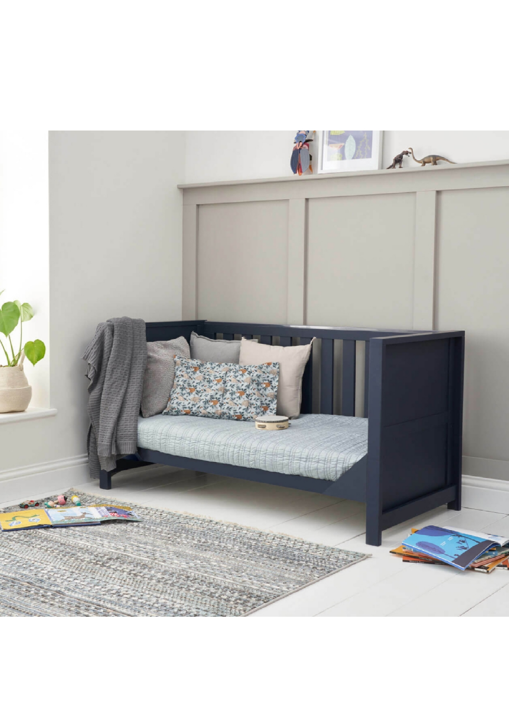 The cot bed has three mattress heights and can be used as a toddler bed up until the age of 4. Style it with some cosy cushions and it also doubles as a comfy sofa or day bed.
