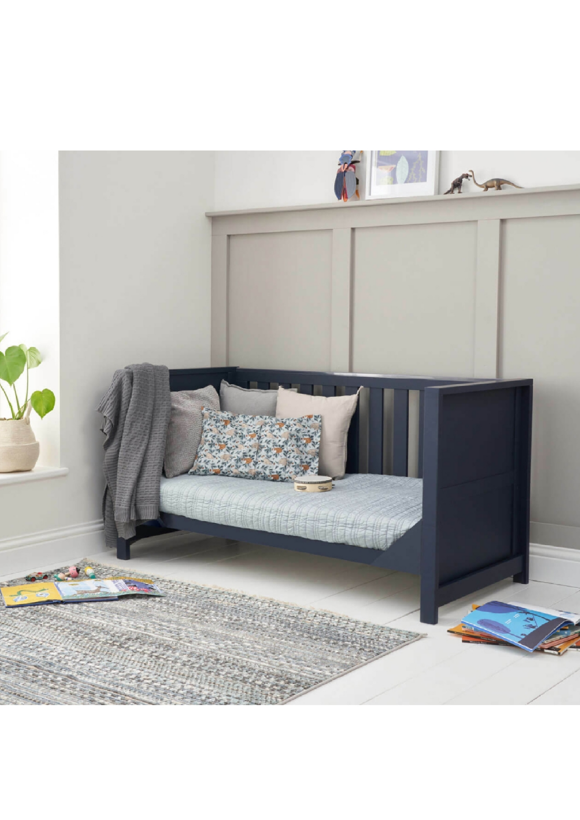 The cot bed has three mattress heights and can be used as a toddler bed up until the age of 4. Style it with some cosy cushions and it also doubles as a comfy sofa or day bed.